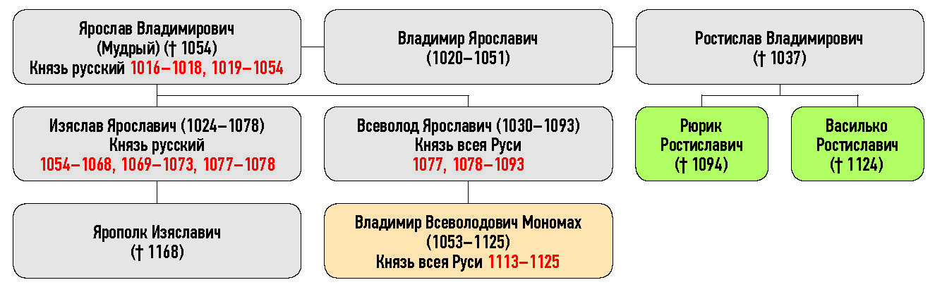 Ярослав Владимирович (Мудрый) († 1054), Изяслав Ярославич (1024–1078) Князь русский, Владимир Ярославич (1020–1051), Ростислав Владимирович († 1037), Ярополк Изяславич († 1168), Рюрик Ростиславич († 1094), Василько Ростиславич († 1124), Всеволод Ярославич (1030–1093) Князь всея Руси, Владимир Всеволодович Мономах (1053–1125)