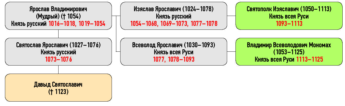 Ярослав Владимирович (Мудрый) († 1054), Всеволод Ярославич (1030–1093) Князь всея Руси, Изяслав Ярославич (1024–1078) Князь русский, Святослав Ярославич (1027–1076) Князь русский, Святополк Изяславич (1050–1113) Князь всея Руси, Владимир Всеволодович Мономах (1053–1125), Давыд Святославич