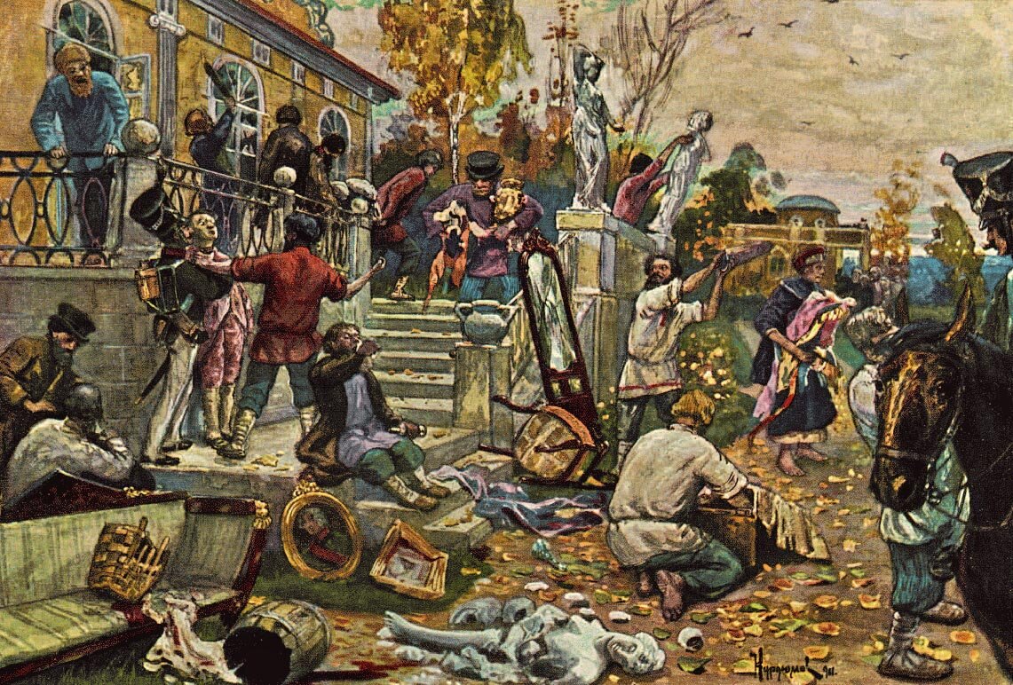 <br>Отечественная война 1812 года; Разграбление крестьянами помещичьей усадьбы после отступления русских войск перед армией Наполеона<br><br>