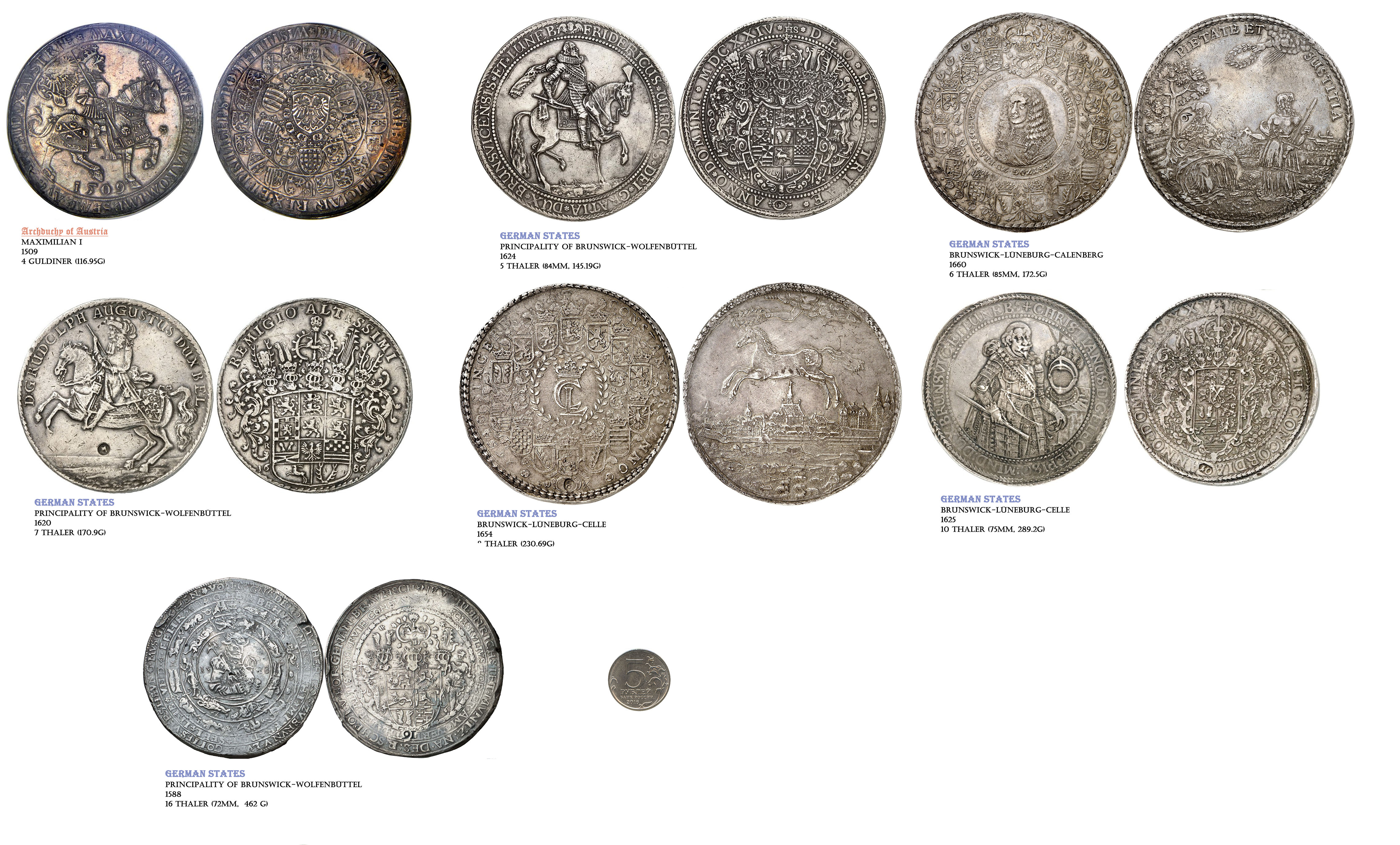 Коллекция талеров от 4 (масса около 110 гр) до 16 (массой больше фунта - около 420 гр) на фоне пяти рублевой монеты