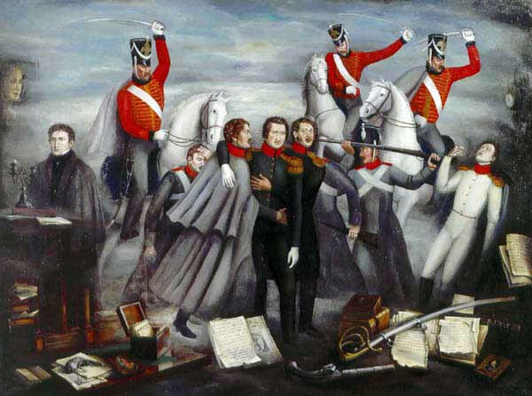 Уже он выстроил два взвода, спеша сделать маневр для сопротивления кавалерии, видевши, что оная приближается; но солдаты вдруг остановились и все закричали: «Стой, не стреляй никто, ружья с плеча!» Сих слов не возможно было слышать противной стороне по причине отдаленности; сделаны были два выстрела картечью, вторым ранило подполковника Муравьева в голову навскользь, отчего он упал на землю. Поручик Бестужев-Рюмин поспешил ему дать свою лошадь; уже нога его была в стремени, как вдруг солдат его же команды вонзил штык в передние ляжки лошади, стащил его с ней и сказал: «Вы нас обманули, отвечайте одни, ни с места!» И в тоже время закричали: «Бросайте ружья! По нас не будут стрелять, когда увидят нас обезоруженными» и разбежались врозь. Кавалерия бросилась в атаку, и все 900 человек забраны. При них взят отставной подполковник Муравьев, который приехал из Петербурга дать знать своему брату о случившемся в оном происшествии
