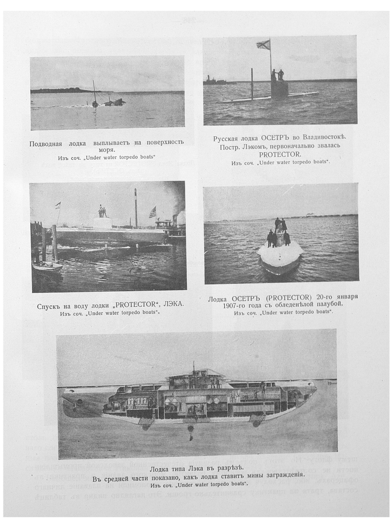 Лодка типа Лэка в разрезе. В средней части показано, как лодка ставит мины заграждения.
