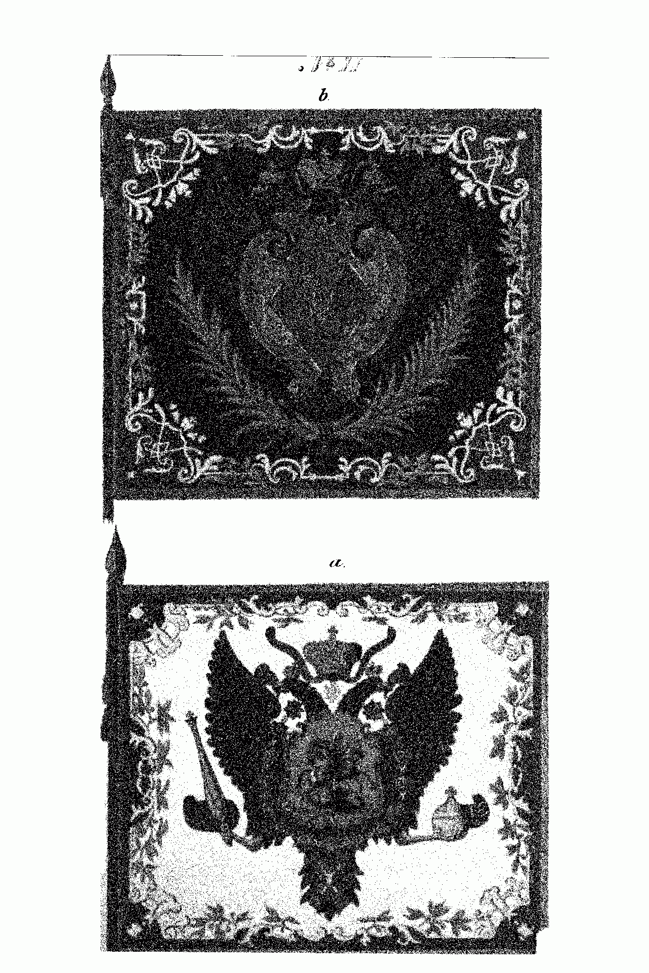 Белое знамя, пожалованное Семеновскому полку Императором Петром II (а) и черное знамя (б), пожалованное Императрицей Анной Иоанновной.