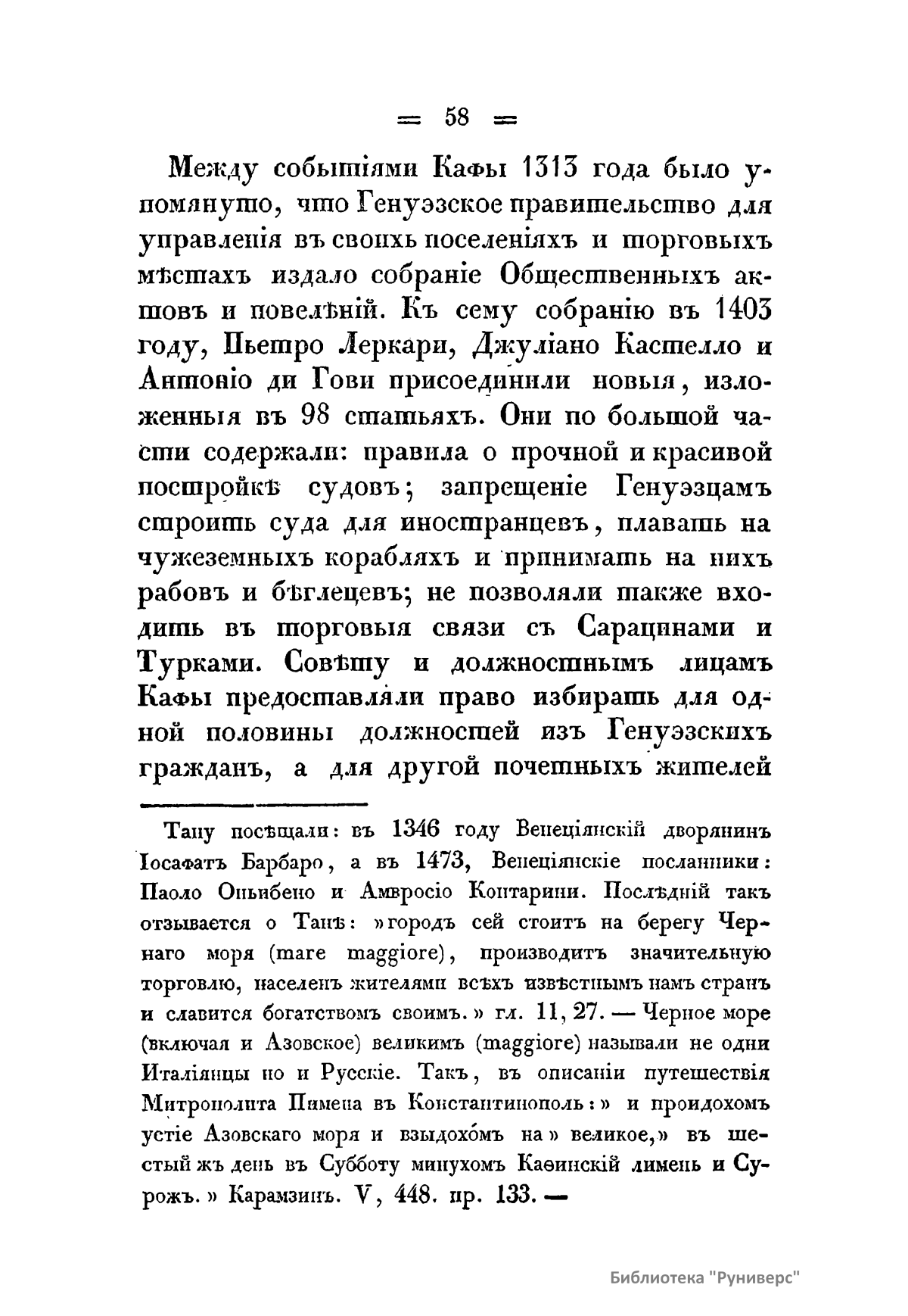 Член Московского общества истории и древностей Российских рассказывает о славном двухсотлетнем пребывании генуэзцев в Крыму и их гибели в 1475 году под ударами турок.