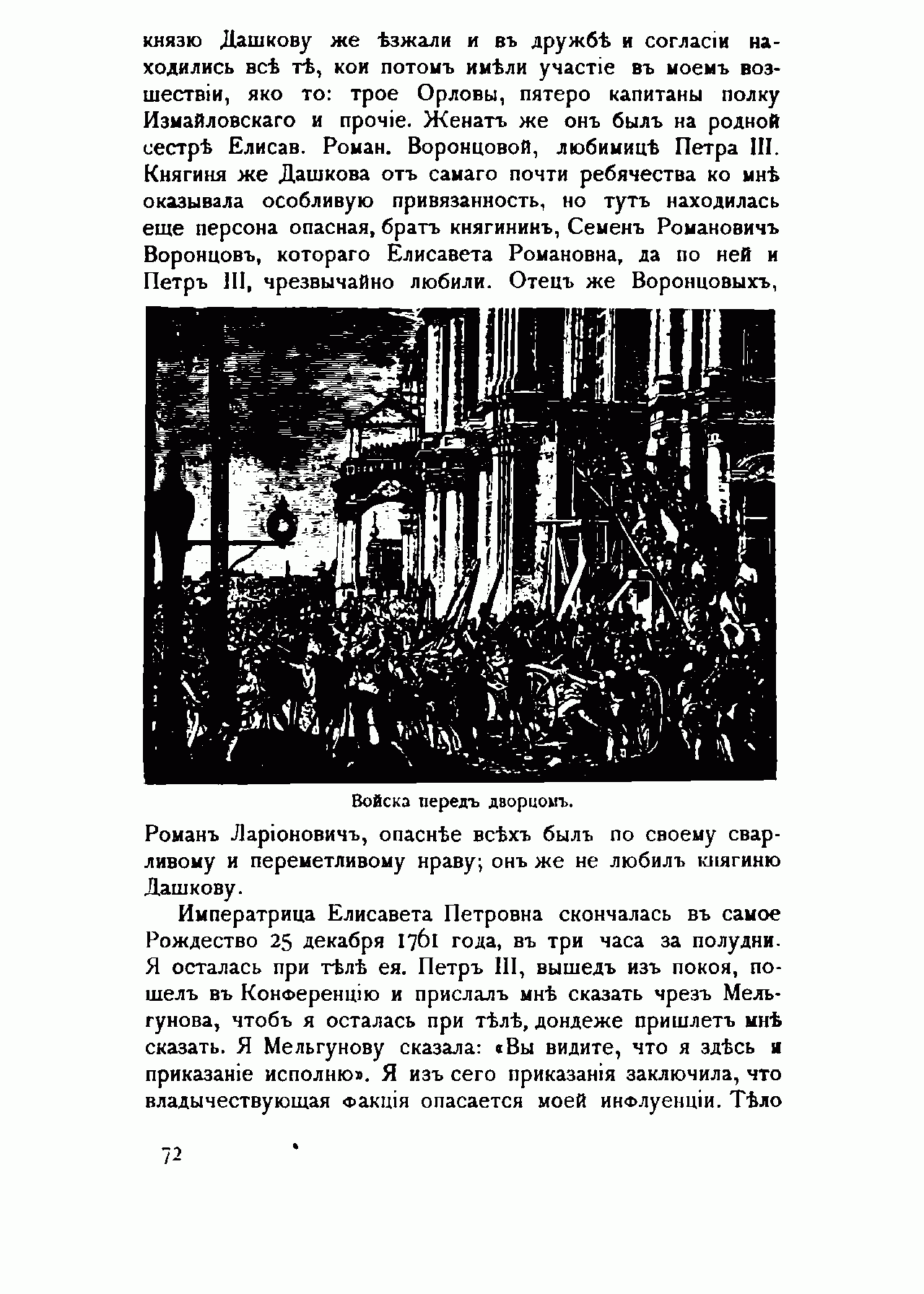 Публикация сочинения секретаря французского посла в России Рюльера о ходе подготовки и осуществлении дворцового переворота 1762 г., приведшая на трон Екатерину II, дополненная многочисленными письмами и воспоминаниями современников. Это издание имело огромную популярность.