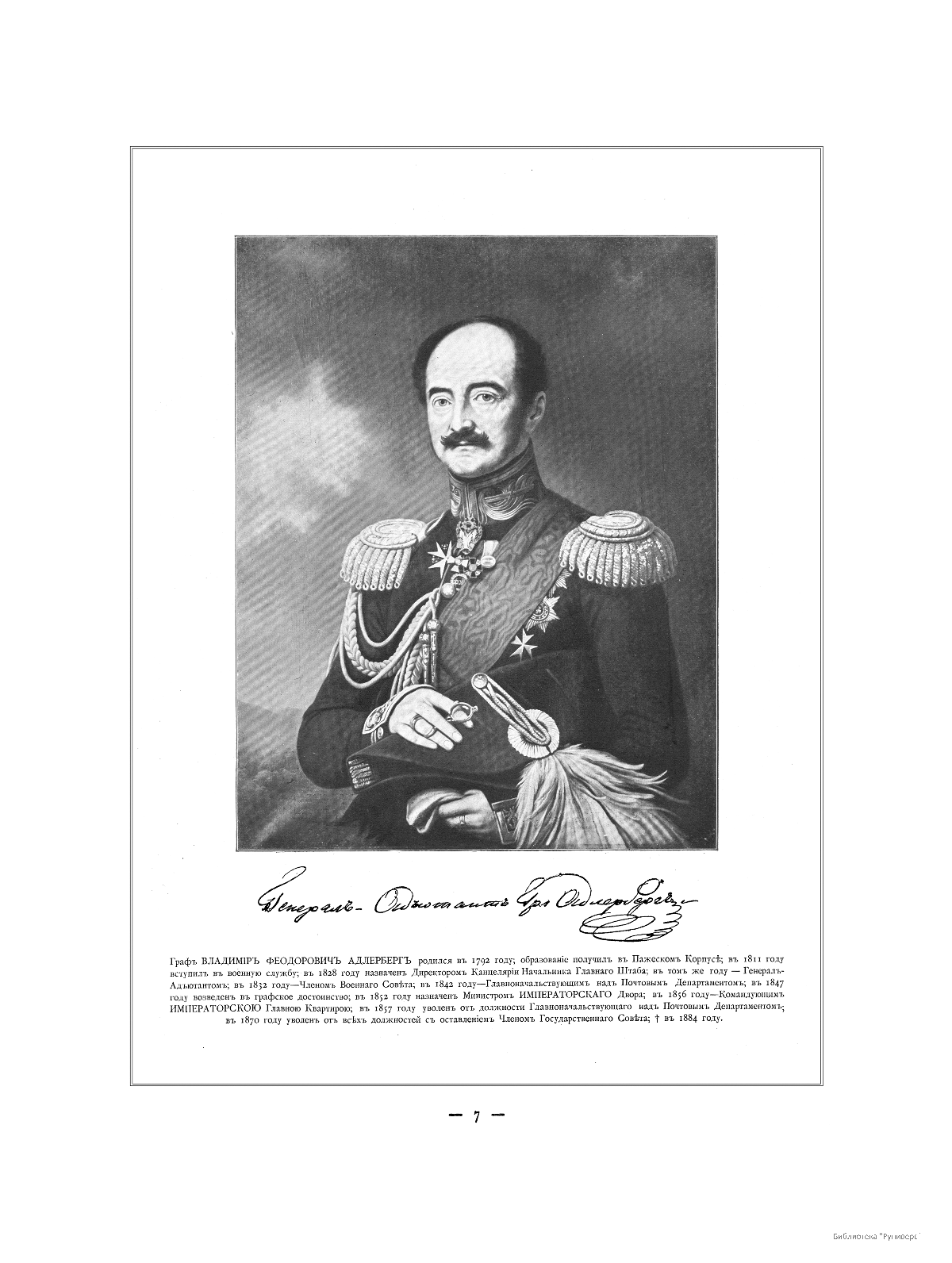 Граф Владимир Феодорович Адлерберг (1792-1884) Генерал-Адъютант, Член Военного Совета, с 1842 - Главноначальствующий над Почтовым Ведомством.