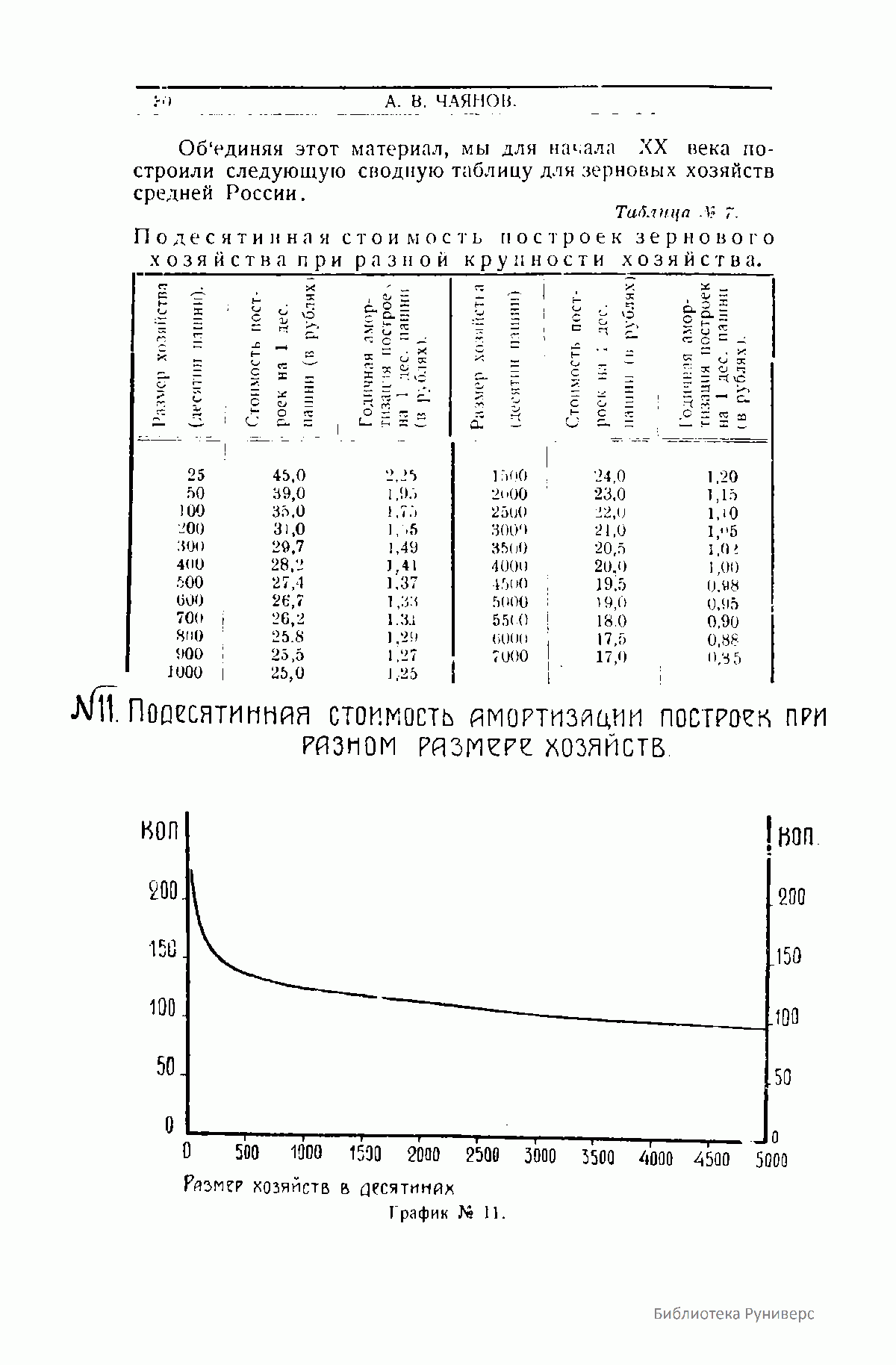График №11. Подесятинная стоимость амортизации построек при разном размере хозяйства.