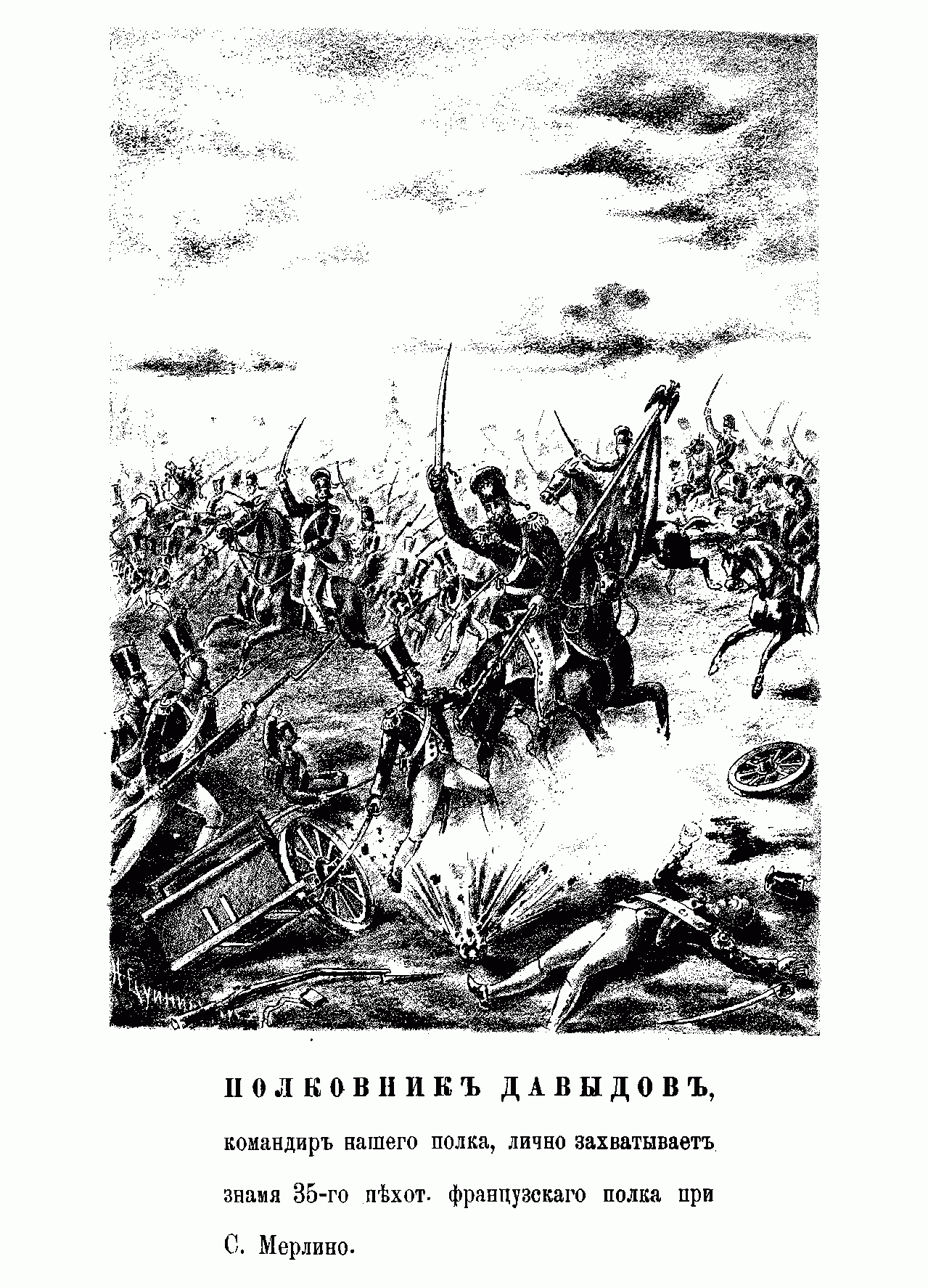 Полковник Давыдов, командир полка, лично захватывает знамя 35-го пехотного французского полка при С.Мерлино.