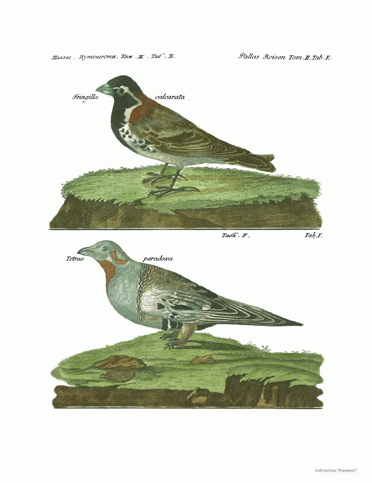 Том II. Таб.Е. Fringilla calcarata. Табл.F. Tetrao paradoxa.