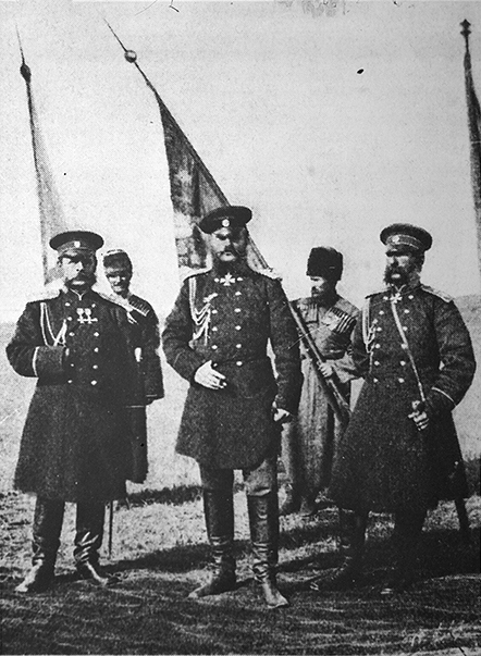 Генерал-адъютант князь Д. И. Святополк-Мирский, великий князь Михаил Николаевич, генерал-адъютант М. Т. Лорис-Меликов в Каре. Фотография 1877 года