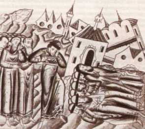 Прибытие великого князя Ярослава Всеволодовича в Суздальский край после нашествия Батыя. Миниатюра из Казанского летописца.