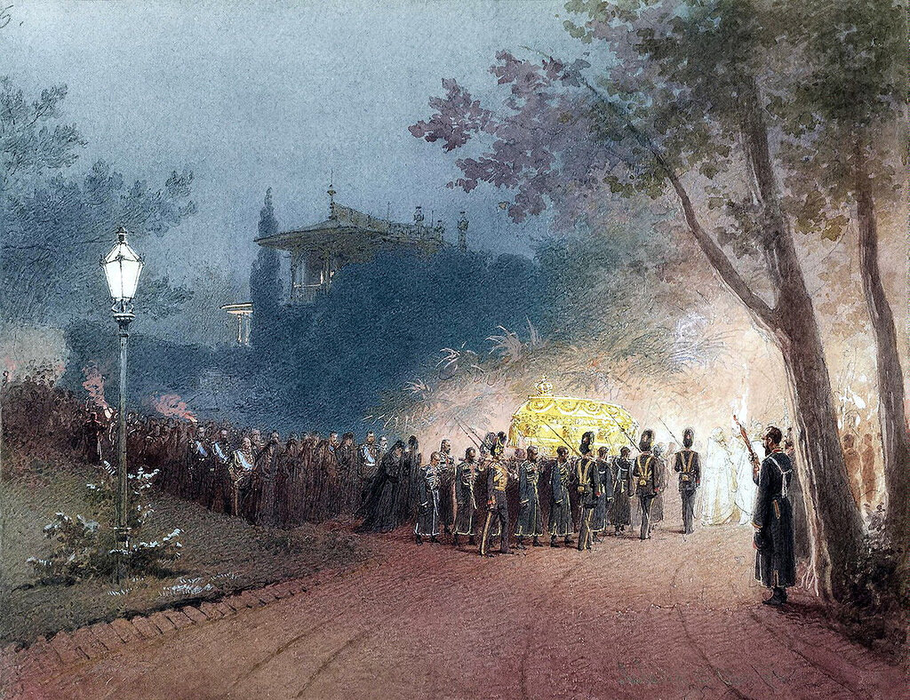 В шесть часов 40 мин. Государь Император Николай Александровичу Наследник Цесаревич, принц Вельсский, Великие Князья и генерал-адъютанты подняли гроб с останками Почившего Монарха, и вынесли его на площадку перед Малым Дворцом, где гроб приняли люди Собственного Его Величества конвоя и поставили на носилки, которые затем были подняты конвойцами на плечи, так что золотой, ярко блестевший при свете факелов, гроб был далеко виден всем. Медленно, шаг за шагом, двинулись люди с драгоценною ношей в гору, предшествуемые певчими и духовенством. За гробом шествовали Государь Император, бывший в форме лейб-гвардии Преображенского полка, и принц Вельсский, вдовствующая Императрица, с Августейшею Сестрой, принцессою Вельсскою, Высоконареченная Невеста Государя Императора Великая Княжна Александра Феодоровна…