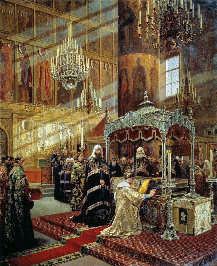 Царь Алексей Михайлович и Никон, архиепископ новгородский, у гроба чудотворца Филиппа, митрополита московского