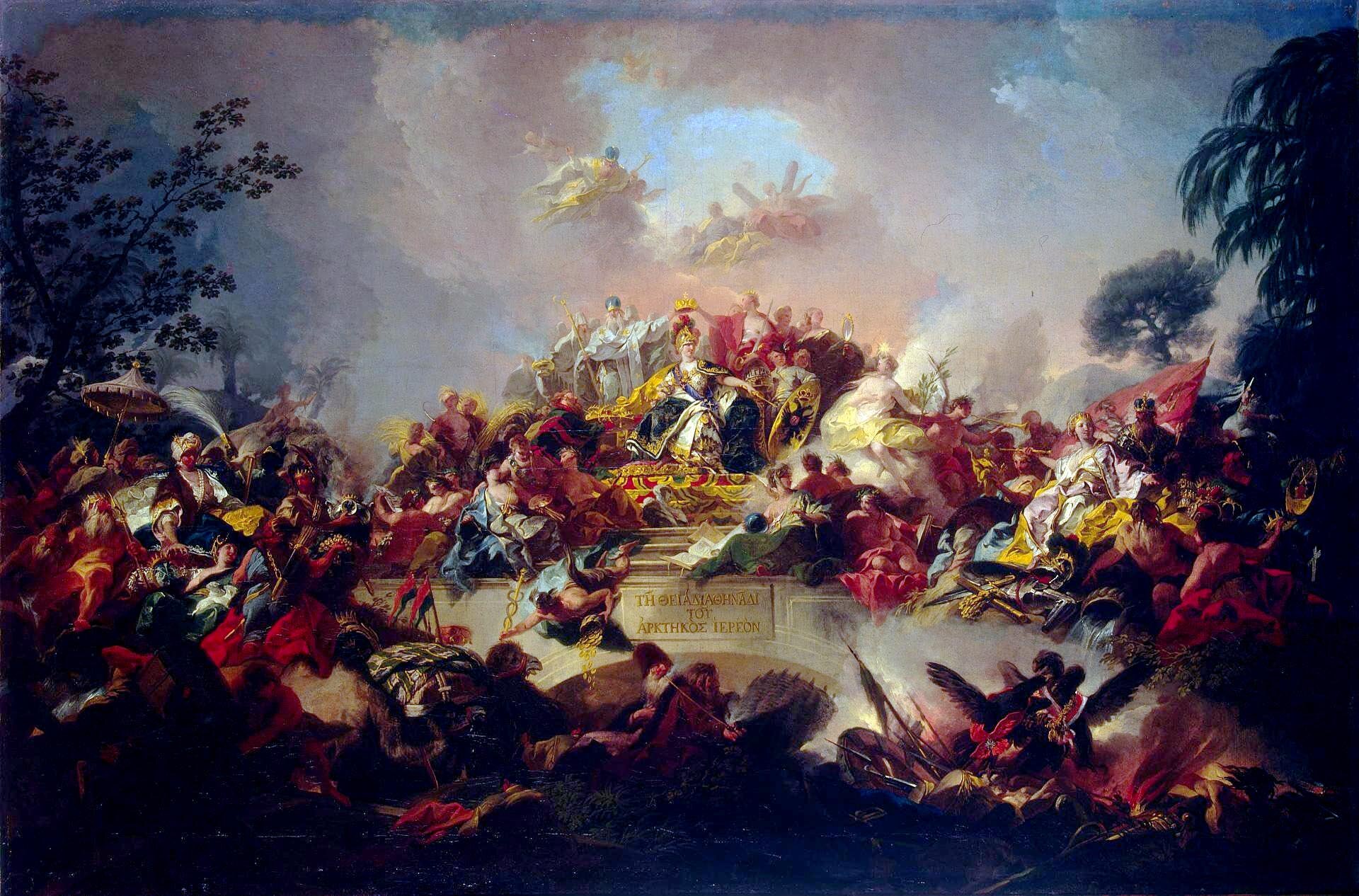 В центре композиции представлена Екатерина II в традиционном для ее аллегорических изображений образе Минервы, богини мудрости, но с царскими регалиями и голубой лентой ордена Андрея Первозванного через плечо. По сторонам от нее фигуры, олицетворяющие духовную и светскую власть, а также аллегории Мира и Благоразумия. Царствование Екатерины - время расцвета наук и искусств, о чем призваны напомнить фигуры Живописи, Музыки, Архитектуры, Астрономии у подножия ее трона. Богатство и процветание страны олицетворяют женская фигура со снопом - Плодородие - и Меркурий, бог торговли и покровитель ремесел, с рогом изобилия, полным золотых монет. С обеих сторон к трону стремятся народы, населяющие империю, а в облаках изображены святые покровители России.