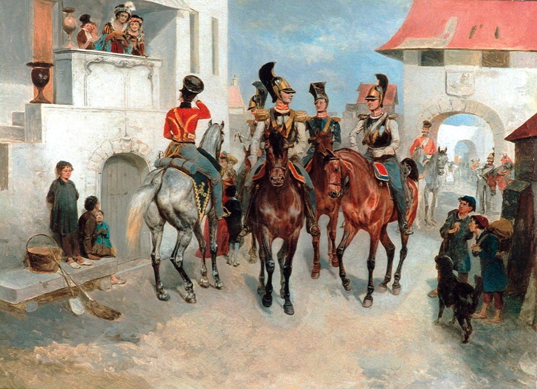 На картине изображена встреча офицеров русской гвардейской кавалерии жителями одного из европейских городов. Здесь изображены (слева - направо) офицер лейб-гвардии Гусарского полка, обер и штаб-офицеры лейб-гвардии Конного полка, обер-офицеры лейб-гвардии Уланского и Кавалергардского полков. На дальнем плане видны нижние чины лейб-гвардии Гусарского и одного из армейских кирасирских полков.