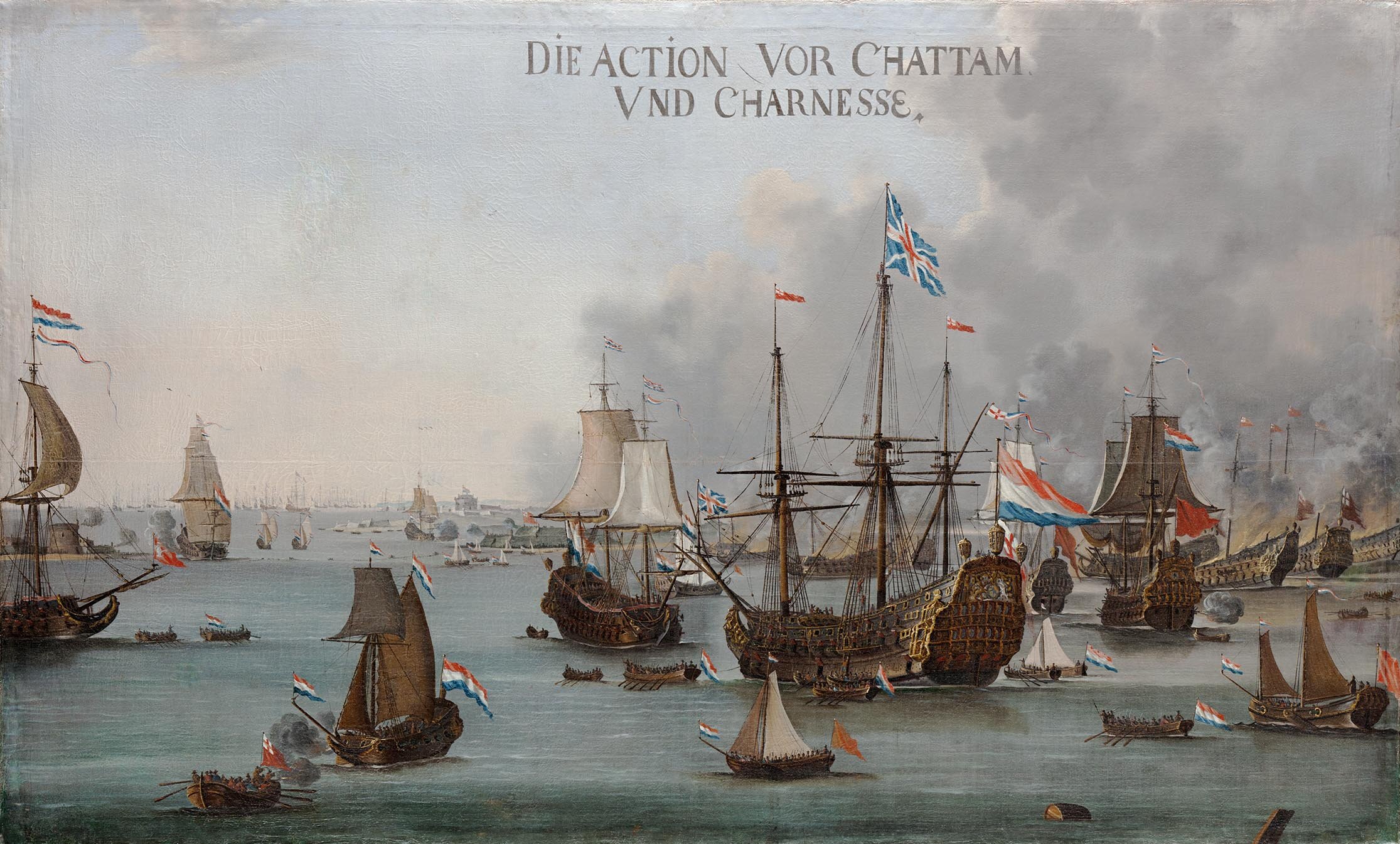 Эскадра де Рюйтера на Медуэе. В центре - захваченный корабль «Ройял Чарлз», на котором одновременно развеваются английские и голландский флаг. Справа видны горящие у берега английские суда, слева - башня замка Апнор.