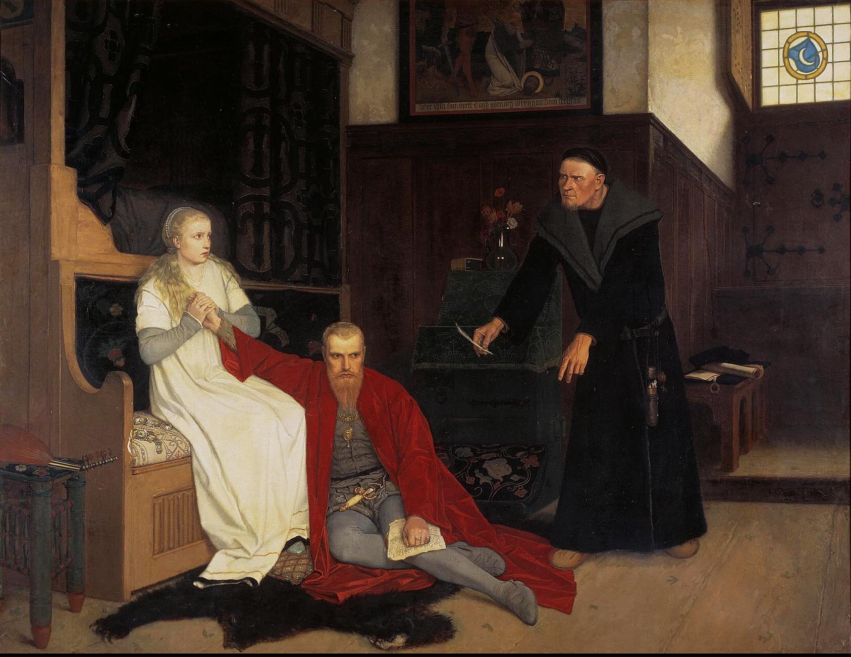 Эрик XIV (швед. Erik XIV, 13 декабря 1533, Стокгольм — 26 февраля 1577, замок Эрбюхус) — король Швеции из династии Васа, правивший с 1560 по 1568 год. Уже в ранние годы его правления обнаружились признаки душевного расстройства, в итоге развившиеся в тяжелое безумие., Катарина Монсдоттер (швед. Каtarinа Månsdotter), или Каарина Маунунтютяр (фин. Kaarina Maununtytär) (1550 —1612) — королева Швеции в течение всего лишь 87 дней. Единственная в истории коронованная представительница финского народа., Йоран Перссон (швед. Jöran Persson) (около 1530 —1568) — шведский государственный деятель, канцлер короля Эрика XIV, который назначил его также прокуратором и главой сыскной комиссии. После свержения Эрика XIV он был казнен в 1568 году по приказанию нового короля Юхана III.