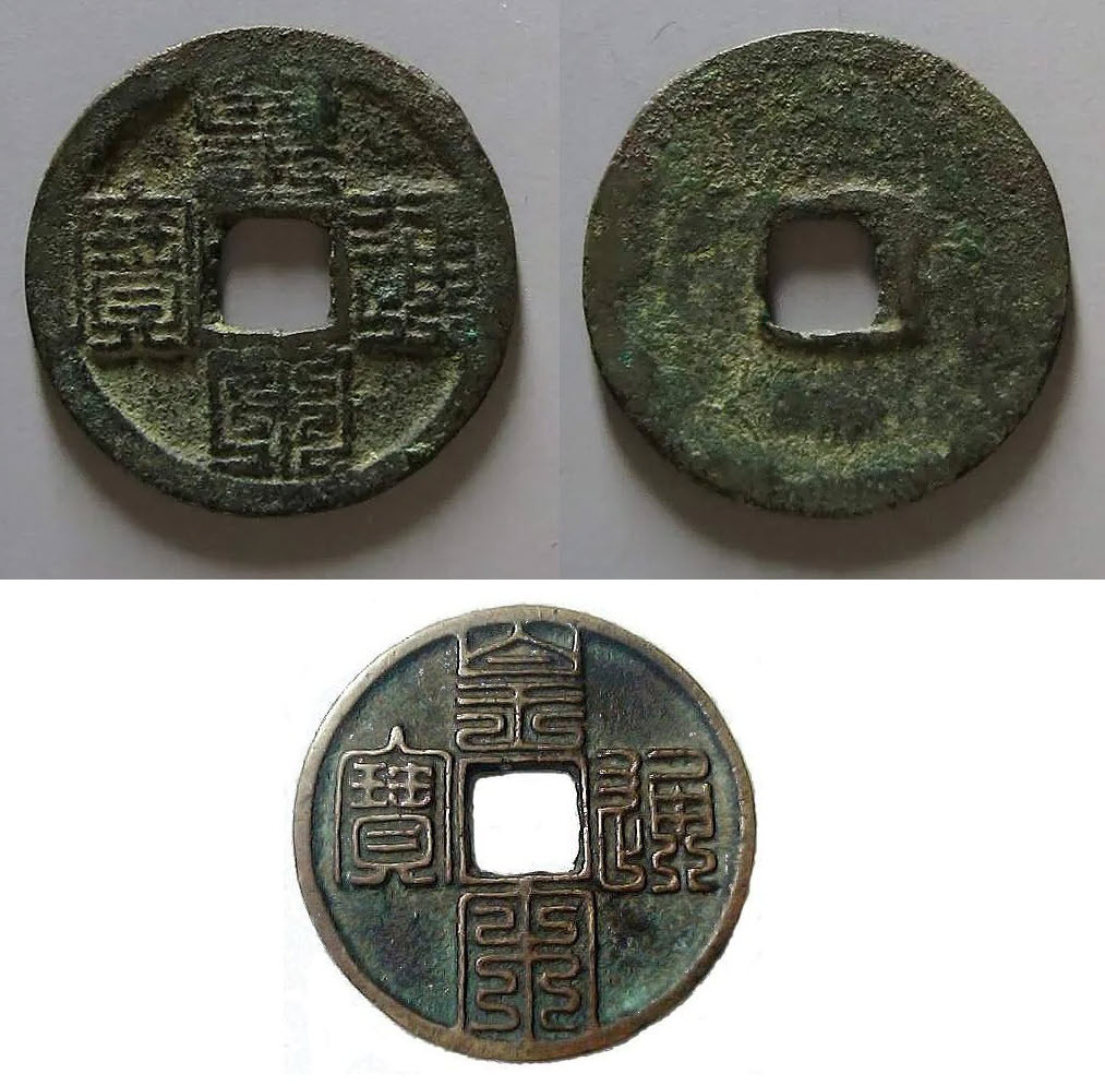 Сверху – подлинная huáng sòng tōngbǎo jiǔ dié zhuàn, проданная за $64.000 на Huaxia Coin Auction в 2019 г., диаметр 24,34 мм, вес 3,6 гр. Снизу – современная копия, приведена чтобы можно было восхититься поразительной каллиграфией.