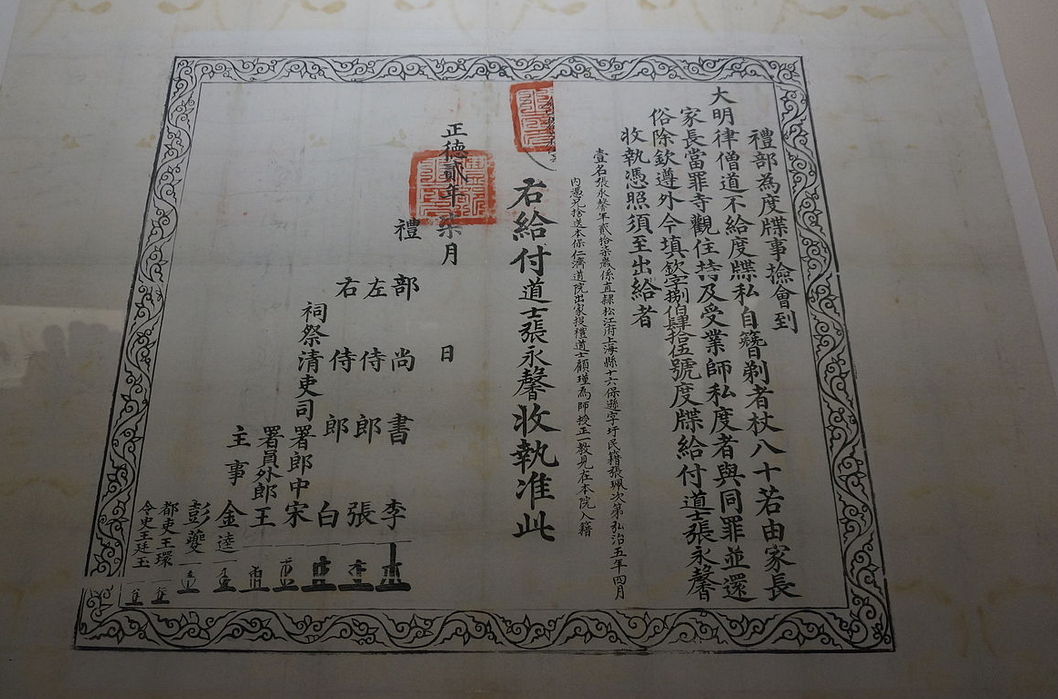 Монахи в Китае освобождались от налогов и имели прочие преимущества, поэтому государство, начиная с появления первых буддистских общин в V-VI вв. тщательно регулировало численность монахов всех конфессий. При Тан что бы стать монахом нужно было пройти специальные экзамены Министерства святынь, после чего получить специальную бирку и удостоверение – dùdié (度牒). После смерти монаха они подлежали сдаче и уничтожению. Монахи, покидающие монастырь, носили бумаги с собой как паспорт. Вплоть до Цин государство пополняло казну, устанавливая квоты на выпуск удостоверений, которые затем могли выкупать общины. В результате монашеские сертификаты несколько веков служили своеобразным аналогом валюты и находились в полусвободном обращении: монастыри приобретали их у государства, а затем могли закладывать, перепродавать и т.п.