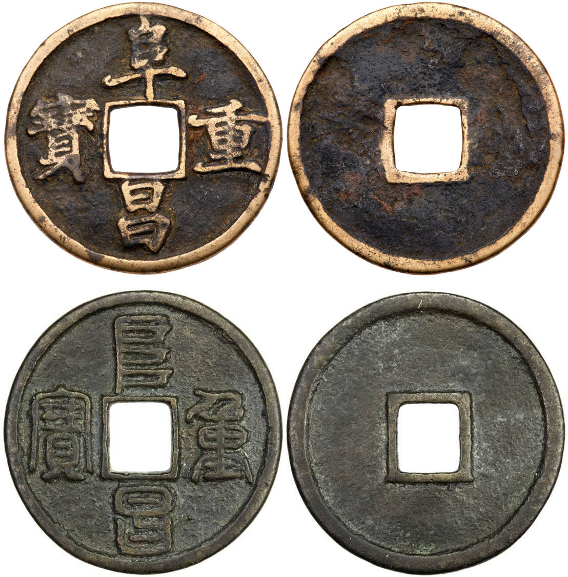 Каждая из трех, причем, была отлита еще и в двух вариантах шрифтов, каллиграфия была превосходной и само качество литья не уступало Сун. Это fù chāng zhòng bǎo (阜昌重寶), номинал 3 вэнь. Сверху – обычный шрифт кайшу (7.9 гр., 34.6 мм., продана за $1400), снизу – пафосный чжуаньшу (10.19 гр, продана за $1500 в 2015 г.).