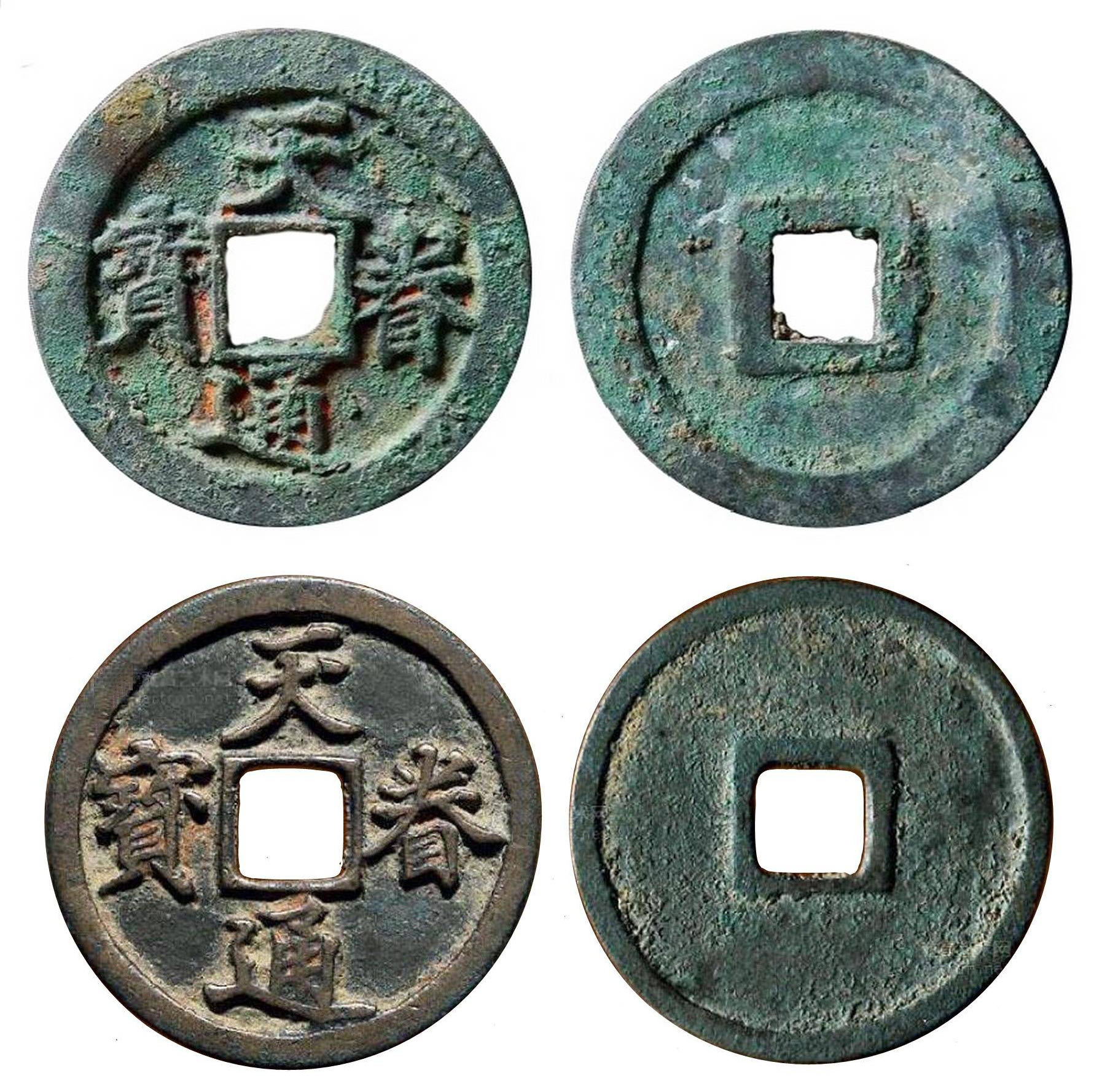 Сверху - tiān juàn tōng bǎo (天眷通寶), 1138-1140 гг. номинал 2 вэнь. Снизу – аналогичная монета с узким ободом, первоначально находилась в коллекции известного пекинского нумизмата Ли Хайбо (李海波)