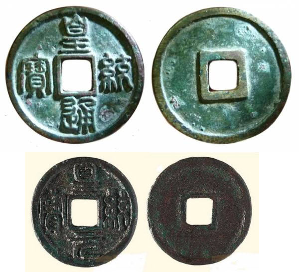 Сверху huáng tǒng tōng bǎo (皇統通寶) следующего за tiān juàn периода: 1141 – 1149 гг. Снизу – аналогичная монета, но в 1 вэнь (3.5 гр, 25 мм) huáng tǒng yuán bǎo (皇統元寶).