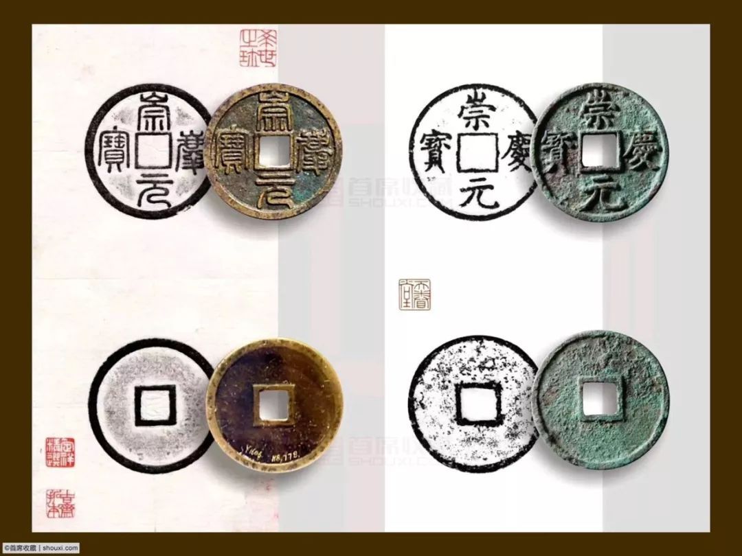 Зато дядюшка Юнцзи прославился выпуском аж трех монет за один 1212-13 г.: chóng qìng tōng bǎo (崇庆通宝), chóng qìng yuán bǎo (崇庆元宝) и zhì níng yuán bǎo (至宁元宝). Первые два выпускались вообще около 4 месяцев. Все они безумно редки. Слева 5 вэнь chóng qìng yuán bǎo из коллекции National Museum of China в Пекине, ранее принадлежала коллекционеру Чэнь Жэньтао (陈仁涛), почерк чжуаньшу, справа – аналогичная почерка кайшу, продана за $300 тыс.