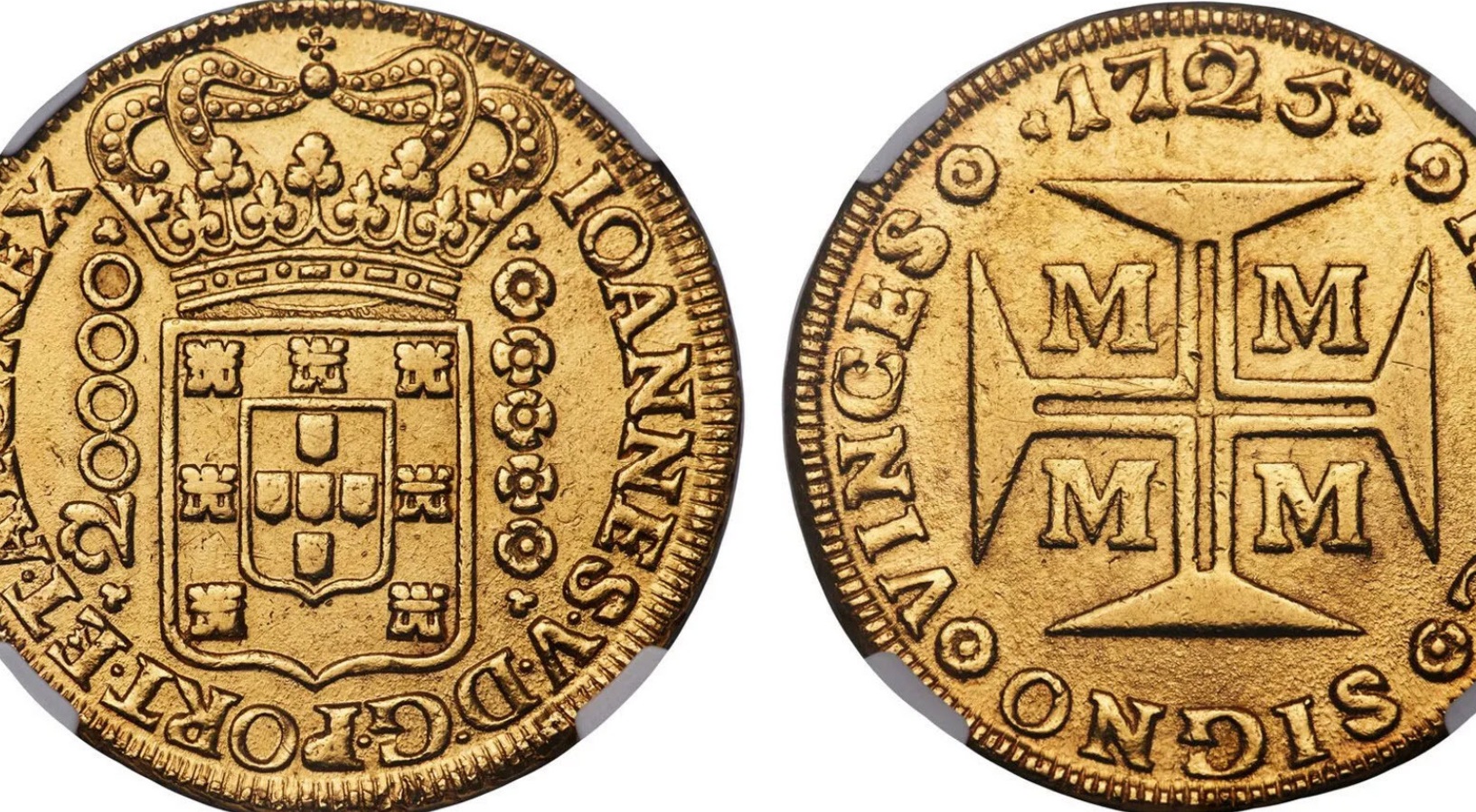 20.000 реалов короля Жуана V Великодушного, отчеканенные в Бразилии в 1725 г. явно говорят нам о невероятном богатсве колоний, по сравнению с метрополиями Пиринейского полуострова. Это одна из самых крупных золотых монет в истории, предназначенных для регулярного обращения, отчеканенная в провинции Вила-Рика (штат Мату-Гросу) и единственная, отошедшая от португальской двадцатиричной системы счисления (по которой самая крупная монеты имела номинал 12.800 реалов). 53.78 гр, 37.8 мм, продана за $8500.