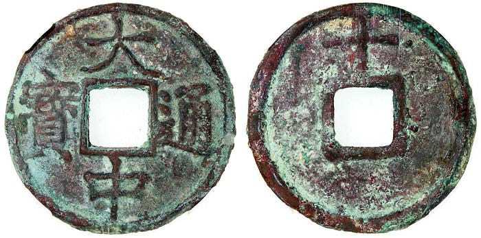 Вот довольно унылые те же 10 вэнь Dàzhōng tōngbǎo без отметки снизу и массой в 23 грамма, оценочная стоимость 300–400 долларов.