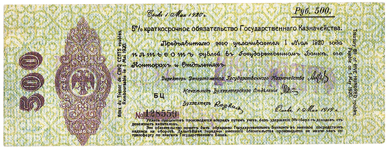 5 % Краткосрочное обязательство Государственного Казначейства. 500 руб. Омск. 1 мая 1919 г. Аверс. Фальшивое