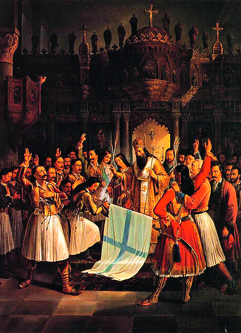 Митрополит Герман благословляет знамя восставших в монастыре Агиа Лавра