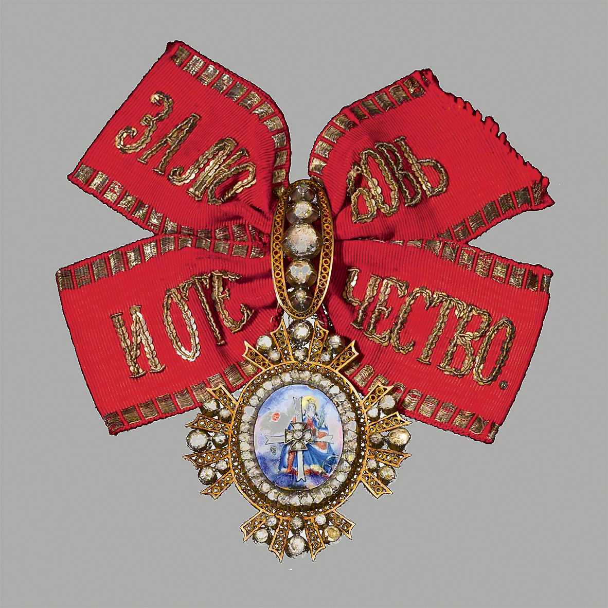 Знак ордена Св. Екатерины, учрежденного в честь достойного поведения супруги Петра I Екатерины Алексеевны во время Прутского похода 1711 г. По легенде Екатерина пожертвовала все свои драгоценности на подкуп турецкого командующего Мехмед-паши, что позволило заключить мирный договор и спасти русскую армию.