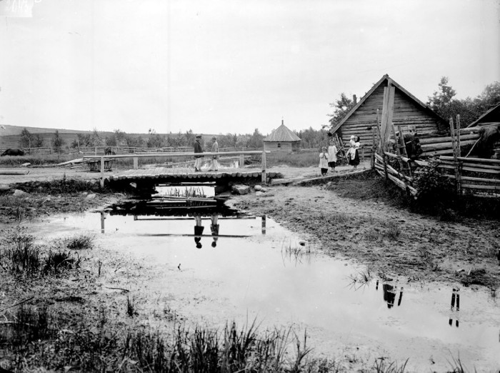 Общий вид деревни Волгино и часовни и первого моста через Волгу.