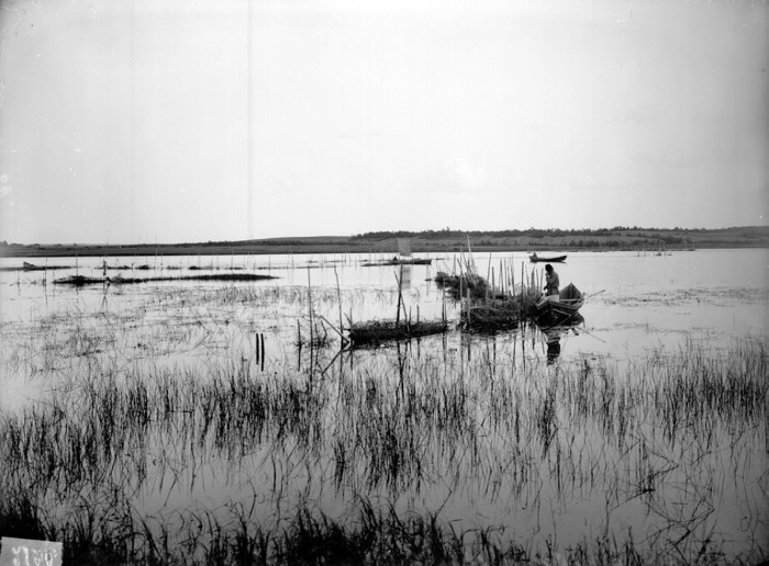Вид Волги и озера Вселуг. Рыболов ставит мережки.