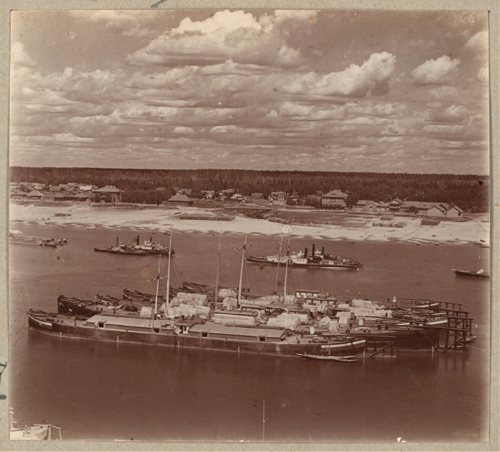 [1910]. Караван судов на Волге. [p] Речной караван - на Волжском бассейне ряд судов, стоящих на якоре или плывущих вместе, причем при сплаве или на буксире суда между собою счаливаются. [p] Фотография вошла в альбом «Российская Империя в цвете, 1909-1915, Владимирская и Ярославская губернии».