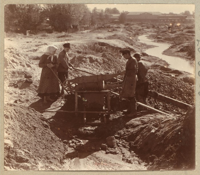 Пермская губерния, Екатеринбургский уезд, Березовский. Промывка старателями золотоносного песка.