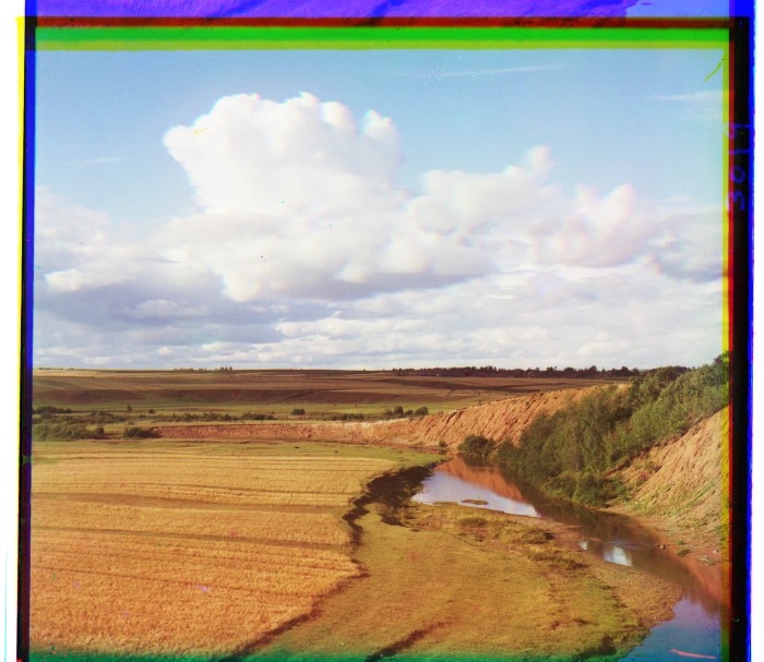 1911. Река Колочь с высоким берегом у деревни Горки.
