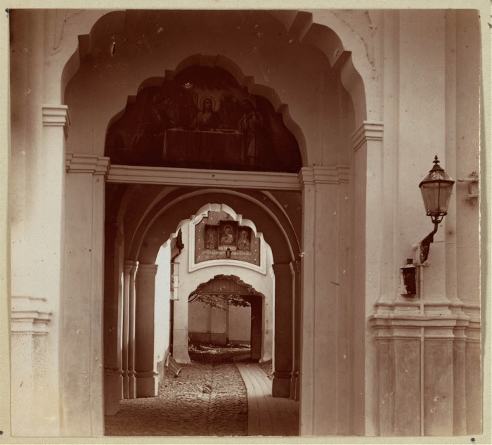 1912. Входные врата Свято-Троицкаго монастыря. Надпись под иконами: "Подъ Твою милость прибегаемъ, Пресвятая Богородице, Спаси насъ!".