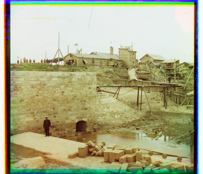 1912. Село Белоомут на реке Оке. Тонкий устой плотины и часть оконченного флютбета.