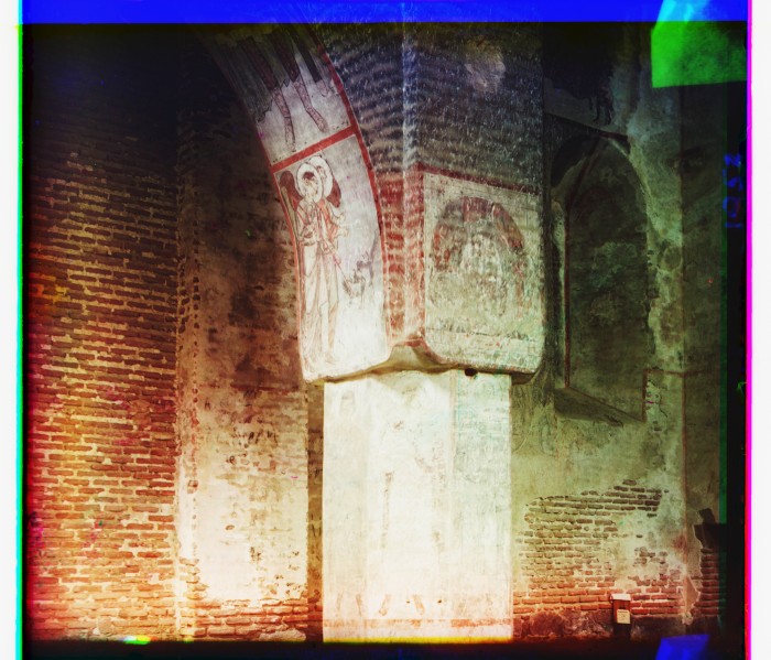 Интерьер храма. Фрески на колонне, неоштукатуренный кирпич.