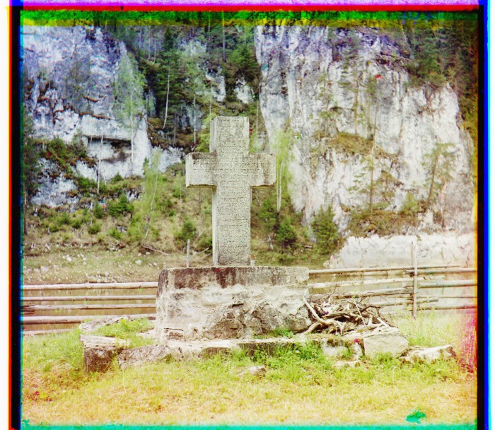Каменный крест, поставленный на берегу против камня Писаного в память Демидова. Река Чусовая. Пермская губерния.