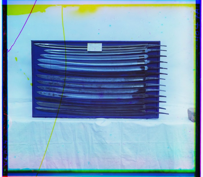 Последовательный ход выделки клинков, ножен и изготовление сварочного булата на Златоустовском заводе. Образцы солдатских шашек. Надпись: "Музей Златоустовского горного округа. Восемь оборотов точки и пять оборотов полировки клинка литой ст. Точильный и полировочн. цех. Златоустовский завод. 1904 г.". Златоустовский завод, г. Златоуст, Уфимская губерния.
