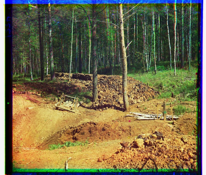 Добытая и сложенная в штабели руда бурого железняка на том же (Шиловском?) руднике. Река Чусовая, Пермская губерния.
