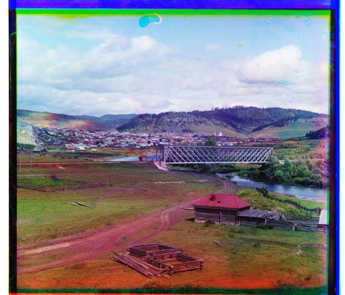 Вид на Миньярский завод. Железнодорожный мост через р. Сим. Уфимский уезд Уфимской губернии.