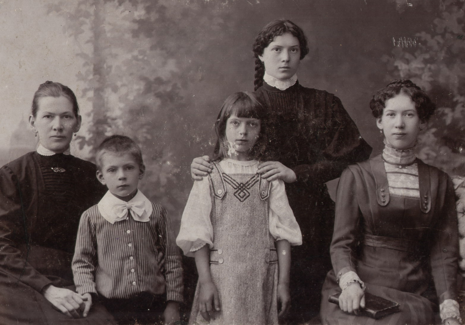 Фотоателье Н. Сажина (?). Семья Тагуновых: первая слева мать Тагуновых (в девичестве Сосунова), второй – сын Серафим, третья – дочь Фаина, четвертая – дочь Елена, пятая (стоит) – дочь Анна. Муром. 1910 год. Архив Тагуновых.