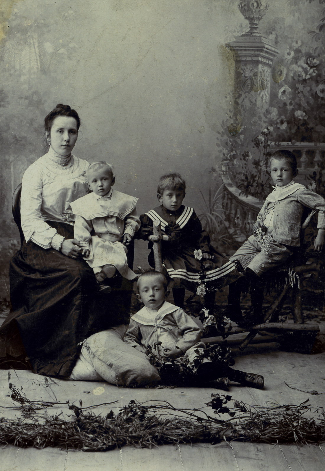 Фотоателье М. Козина. Наталья Ивановна Зворыкина (Гундобина) с детьми: Владимир, Ольга, Николай, Иван. Вязники. 1902. Архив Зворыкиных.