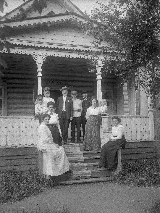 Группа людей на крыльце дома. Вторая слева – Л.Д. Зевеке с сыном Георгием. Автор: В.А. Зевеке Место события: г. Н.Новгород Дата: нач. ХХ в.