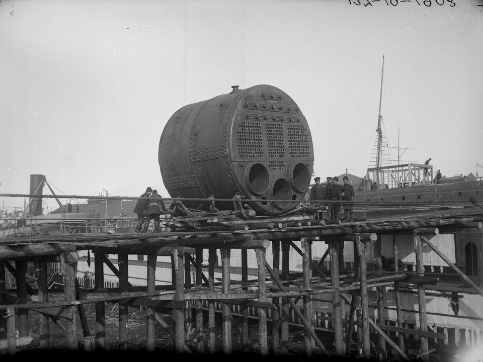 Сормово. Погрузка котла на шхуну «Слава». Дата: 1905 г.Место съемки: г. Н.Новгород Автор: М.П. Дмитриев