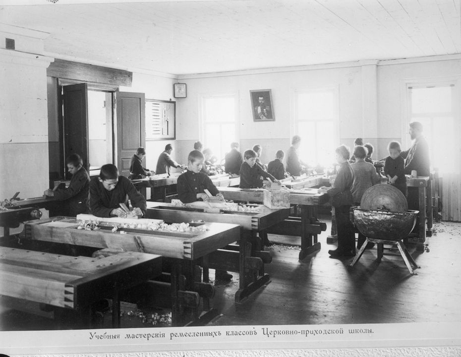 Школа имени Александра III. Вид учебной мастерской ремесленных классов. Дата: 1909 г. Место съемки: г. Н.Новгород Автор: М.П. Дмитриев