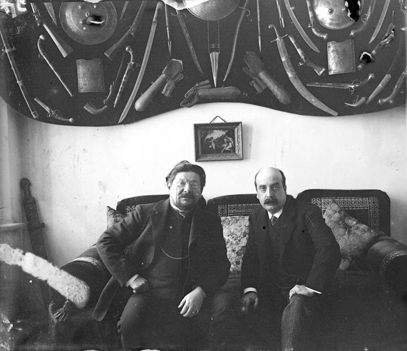 Парный портрет. Мужчины на диване (сидят). На заднем плане - стена с коллекцией оружия. Автор: А.А. Зевеке Место события: г. Н.Новгород Дата: к. XIX - нач. ХХ вв.